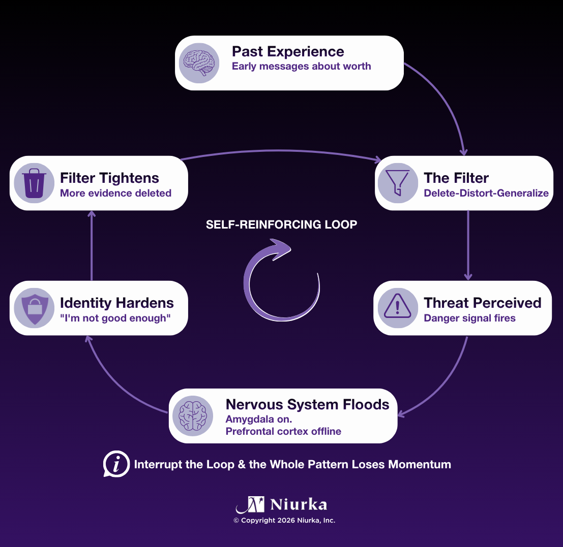 Each time you reinforce the doubt, you're wiring your brain to diminish the reward signals after success. The filter tightens, finding even more evidence of inadequacy, and deleting evidence of your true abilities.